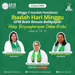 Ibadah Hari Minggu, 23 Juni 2024| PF: Pdt. Sarinah Allo Layuk (06.00), Pdt Eufrasia H. A. Jacom-R. S.Th. (09.00) & Pdt. Malia M. Lenakoy, S.Si-Teol (18.00)