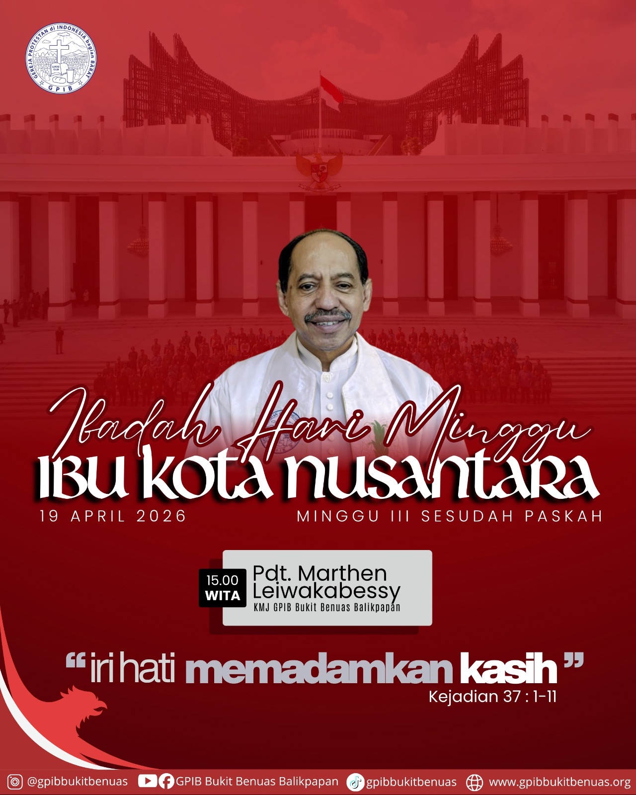 Ibadah Minggu I: 06:00 , Ibadah Minggu II: 09:00 , Ibadah Minggu III: 18:00 || Mobile Phone: +62 8510 0028 896 || Phone: (0542) 8870020 || Email: sekretariatbukitbenuas@gmail.com